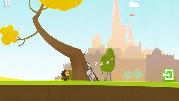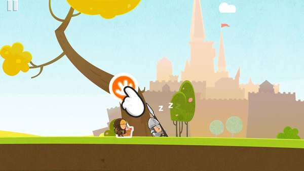 第一关咱们是要在一个沉睡的士兵身边拿走果篮,非常简单,操控游戏人物直接是点击屏幕就可以移动,当移动到可以使用动作的物品旁边时,会有相应的动作。