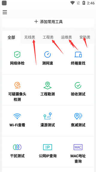 点开无线类,拥有网络体验、测网速、终端查找、wifi查看、漫游测试等功能;