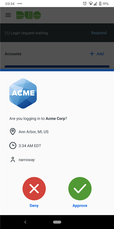 当屏幕上显示 Duo Push 通知时,轻触指示的位置以查看可用操作:批准或拒绝。
