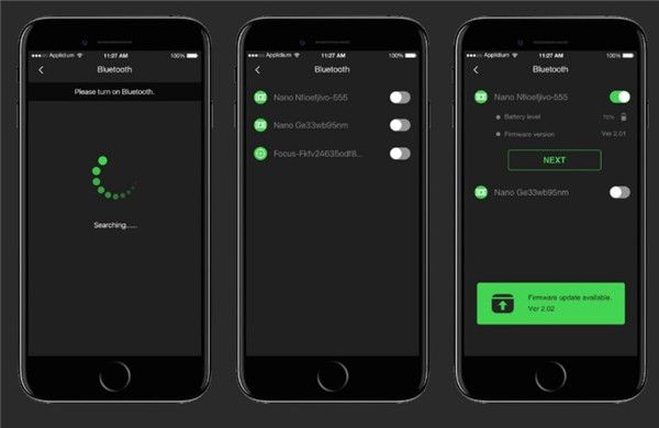 长按设备开机按钮后,打开手机蓝牙和打开应用程序选择设备 Nano,待 app 搜索到相应设备,则出现蓝牙列表,在该列表中找到您的 Nano 设备后打开即显示该设备的电量和版本号,可按“下一步”将应用程序和设备连接。若界面底部出现一个硬件更新包,用户可根据自己的实际情况选择是否更新固件版本。在更新固件的过程中请耐心等待尽量不要在更新过程中做其他操作或者频繁操作,以免造成设备卡死或更新失败。