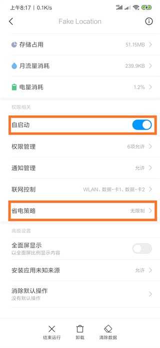 ●小米手机:进入应用详情页,打开“自启动”开关,并把“省电策略”设为无限制,如下图所示