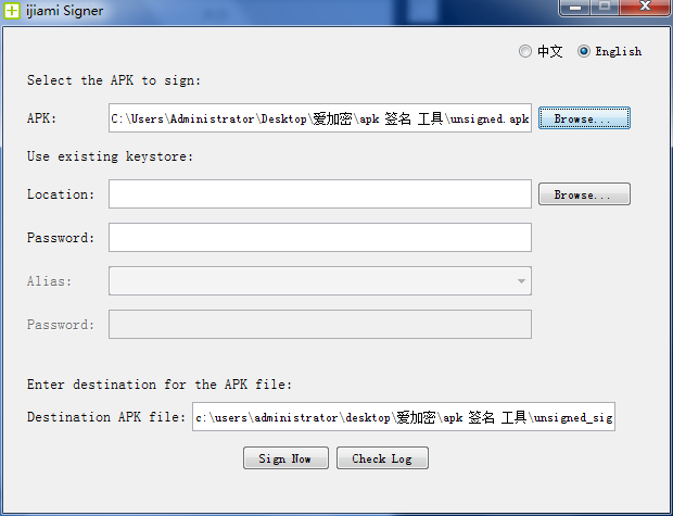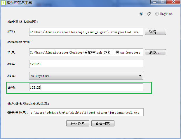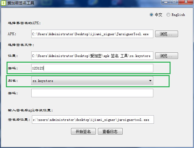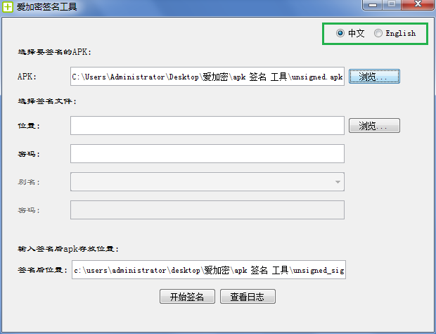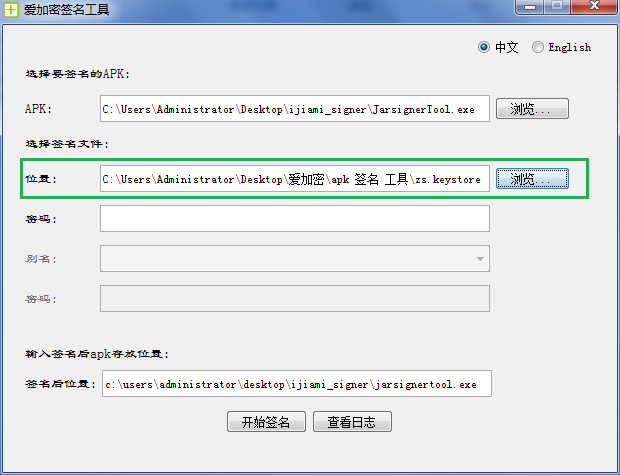 选择签名后apk的储存的位置(工具会自动选择并填写同需签名文件同文件夹)