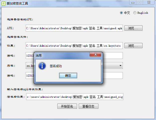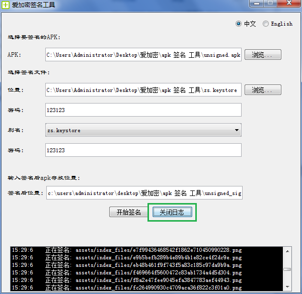 开始签名(在点击工具“开始签名”后工具开始对apk进行签名操作)