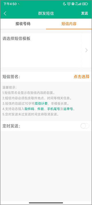 短信模板:模板云端保存,发送时选择添加模板即可,不用再次编辑内容,可大大提高工作效率。