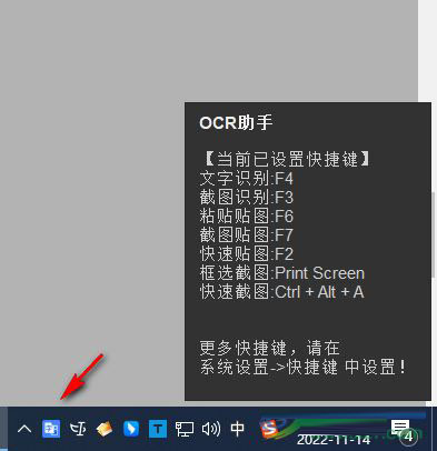 如图所示,软件自动在后台运行,显示经常使用的快捷键,您需要记住这里的快捷键