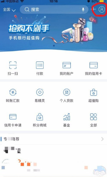 第七步,来到上海银行APP页面后,点击页面右上角的人形图标。