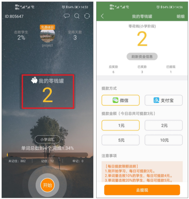 方法一:在考纲词汇记完以前,通过记单词赚零花钱。(小学阶段894个的单词,初中阶段1628个单词,高中阶段3594个单词)