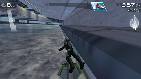 上方的能量条是显示充能进度的,当能量条满了后则可以获得一次加速的机会,火焰标志会亮起。能量条的充能是需要玩家在冲出高台后做出一套完整的动作,动作失败或者没做都不能获得充能,而能量的多少则是根据玩家做出动作的难度来定,难度越高则能量越多,所以想要尽快完成充能获得加速就要挑选一些高难度动作来做。