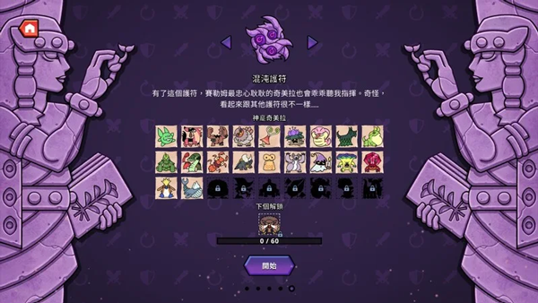 游戏有上百种的奇美拉,他们能做为同伴,同时也是我们会遭遇的强大敌人,奇美拉种类大致对应玩家可以获得的五种骰子护符,开局前选择的护符会决定这一轮招募到哪些奇美拉,五种护符的风格都不太一样,初期只能用「战士」护符,招募到的奇美拉基本为战斗型,破关可依序解锁「风暴」对应敏捷型、「狂怒」对应潜力型、「苦痛」对应自损型,以及全破后能招募赛勒姆挥下BOSS的「混沌」护符。