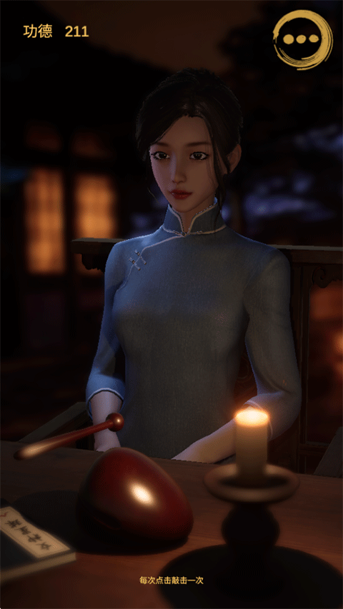 进入静心木鱼游戏后,一位身着灰色旗袍、气质温婉的女施主便会映入眼帘,她将安静地注视着您,仿佛在静候一场心灵的对话。