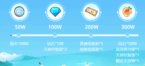 预约人数300w:1000*钻石,高级体力果*1、天使经验果*1、限定手持物*1