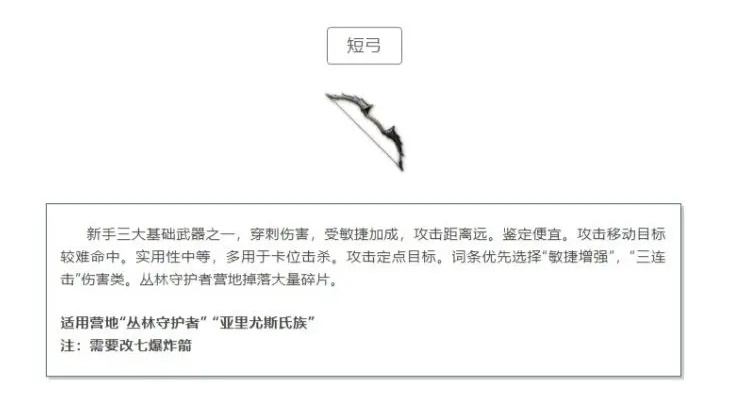 短弓同样是新手的三大基础武器之一,具有穿刺伤害,受敏捷加成,攻击距离远。鉴定费用便宜,但攻击移动目标较难命中,实用性中等,多用于卡位击杀。攻击定点目标时,词条优先选择“敏捷增强”和“三连击”伤害类。短弓的碎片主要在丛林守护者营地掉落。适用营地包括“丛林守护者”和“亚里尤斯氏族”。需要注意的是,短弓需要改造七爆炸箭才能发挥更大的作用。