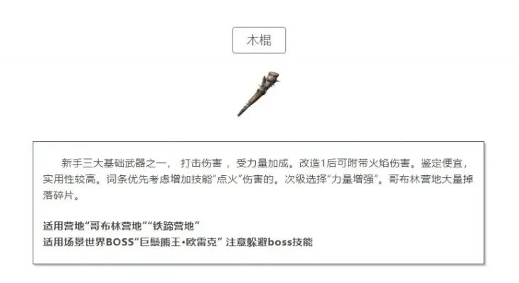 木棍是新手的三大基础武器之一,具有打击伤害,受力量加成。改造1后可附带火焰伤害,实用性较高。鉴定费用便宜,词条优先考虑增加技能“点火”伤害的,次级选择“力量增强”。木棍的碎片主要在哥布林营地掉落。适用营地包括“哥布林营地”和“铁蹄营地”。在面对世界BOSS“巨鬃熊王欧雷克”时,木棍也是不错的选择,但需要注意躲避BOSS的技能。