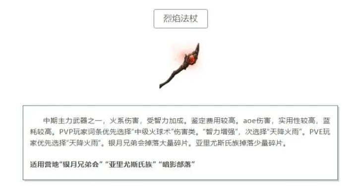 烈焰法杖是中期的主力武器之一,具有火系伤害,受智力加成。鉴定费用较高,但AOE伤害实用性很高,蓝耗也较高。对于PVP玩家,词条优先选择中级火球术“伤害类”和“智力增强”,次选择“天降火雨”;对于PVE玩家,优先选择“天降火雨”。烈焰法杖的碎片主要在银月兄弟会掉落大量,亚里尤斯氏族掉落少量。适用营地包括“银月兄弟会”“亚里尤斯氏族”和“暗影部落”。