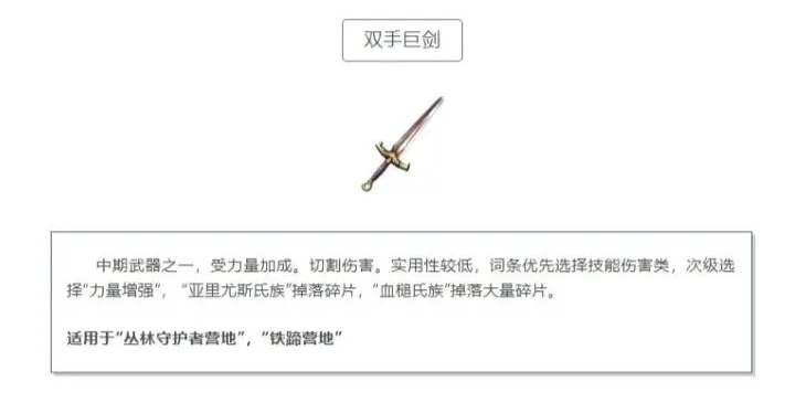 双手巨剑是中期的另一把武器,受力量加成,具有切割伤害,实用性较低。词条优先选择技能伤害类,次级选择“力量增强”。双手巨剑的碎片主要在亚里尤斯氏族掉落少量,血槌氏族掉落大量。适用于“丛林守护者营地”和“铁蹄营地”。