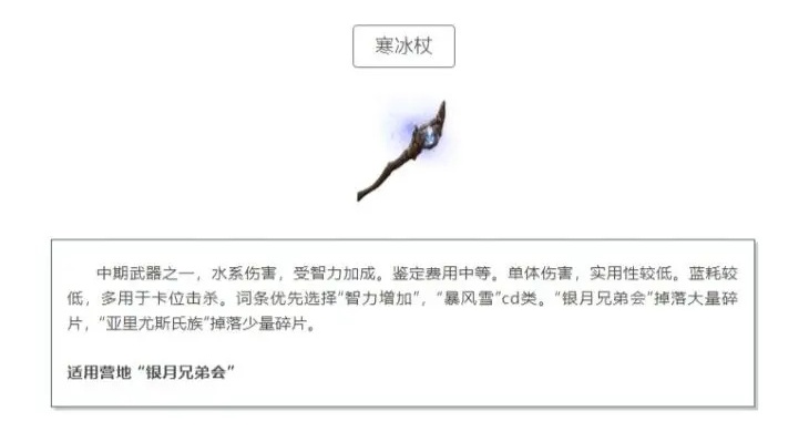 寒冰杖是中期的另一把武器,具有水系伤害,受智力加成。鉴定费用中等,单体伤害实用性较低,但蓝耗较低,多用于卡位击杀。词条优先选择“智力增加”和“暴风雪”CD类。寒冰杖的碎片主要在银月兄弟会掉落大量,亚里尤斯氏族掉落少量。适用营地主要是“银月兄弟会”。