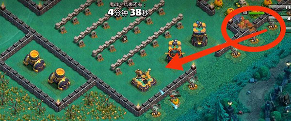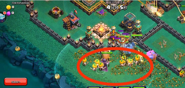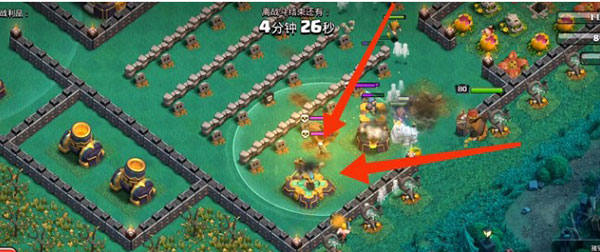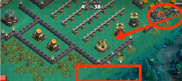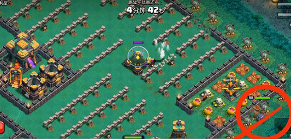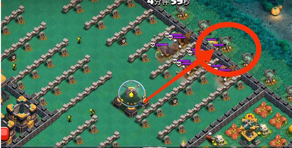女王在拆炸弹塔的时候,就在下面的红色方框内下南瓜头野蛮人,10个左右就够,吸引x弩仇恨。这样可以进一步保证女王和女武神的状态良好。