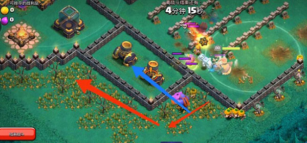女王拆掉x弩后,在如图所示位置放超级蓝胖,超级蓝胖会先按蓝色箭头方向摧毁两个迫击炮,然后往红色箭头方向移动。