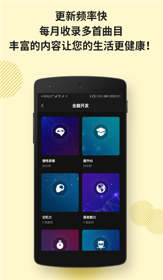 1.基于脑科学原理,提供科学有效的脑波训练方案,所有课程均通过临床验证,效果达标率92.7%。